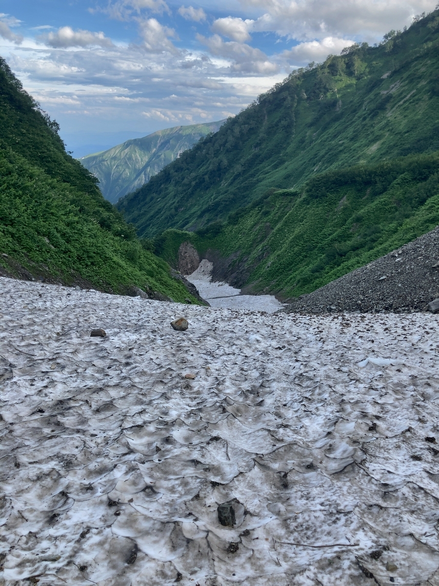 今年初めての北アルプス登山は、夏でも残る雪渓・山中の温泉・天上の花畑・雄大な稜線と、高山の魅力を満喫できた会心の山行となったので記録を残す。